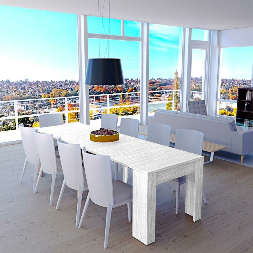 Grazie ai suoi solidi meccanismi a scomparsa, il nostro tavolo allungabile si trasforma con poche e semplici mosse da una semplice consolle in un tavolo in grado di ospitare fino a 14 posti.