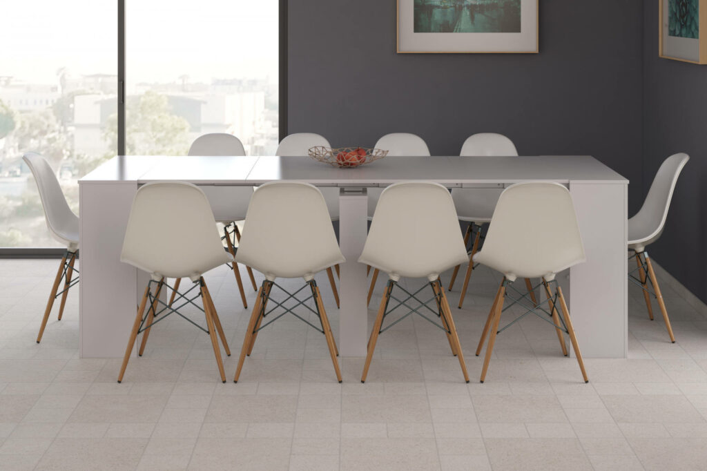 Grazie ai suoi solidi meccanismi a scomparsa, il nostro tavolo allungabile si trasforma con poche e semplici mosse da una semplice consolle in un tavolo in grado di ospitare fino a 14 posti.